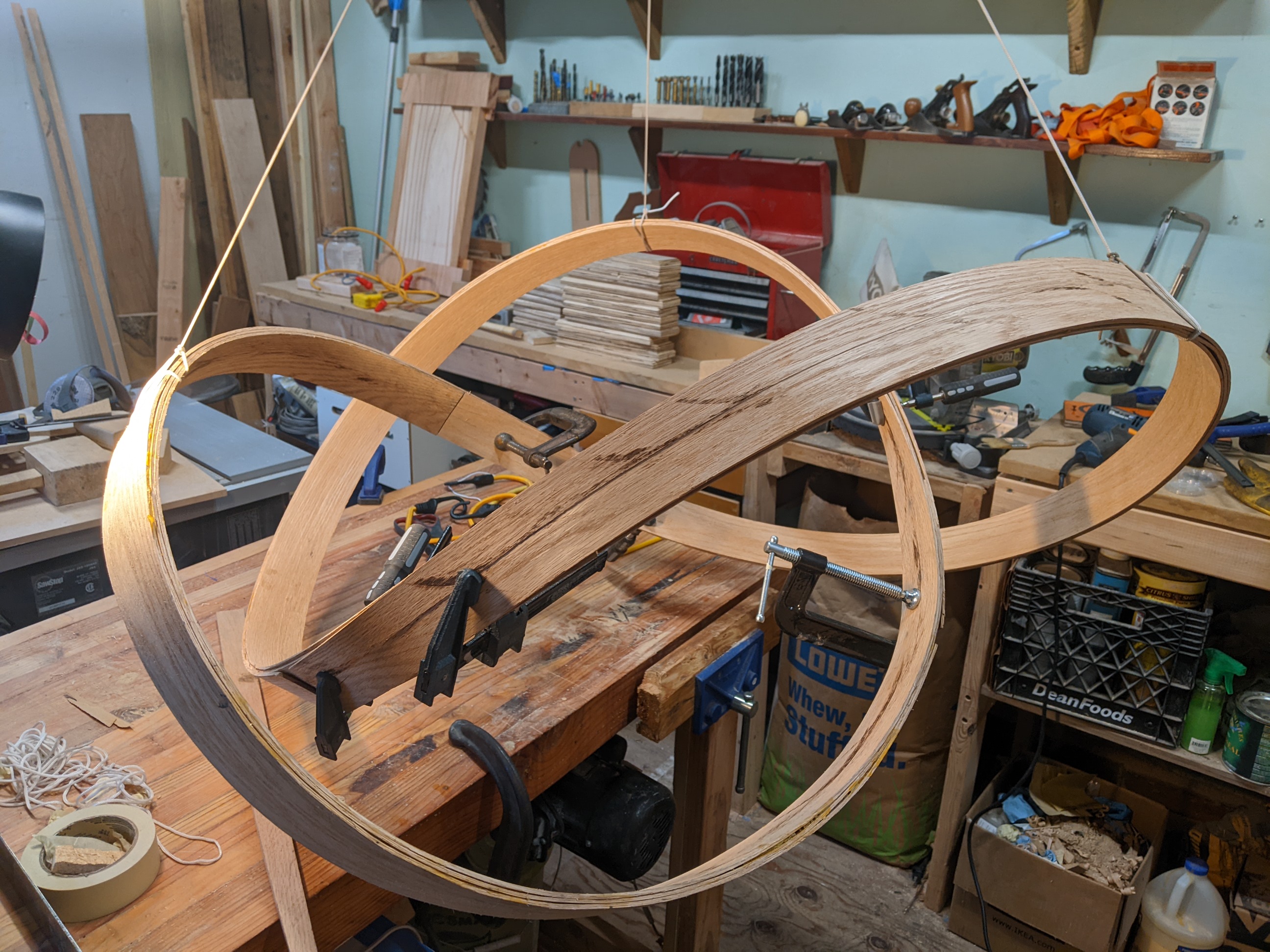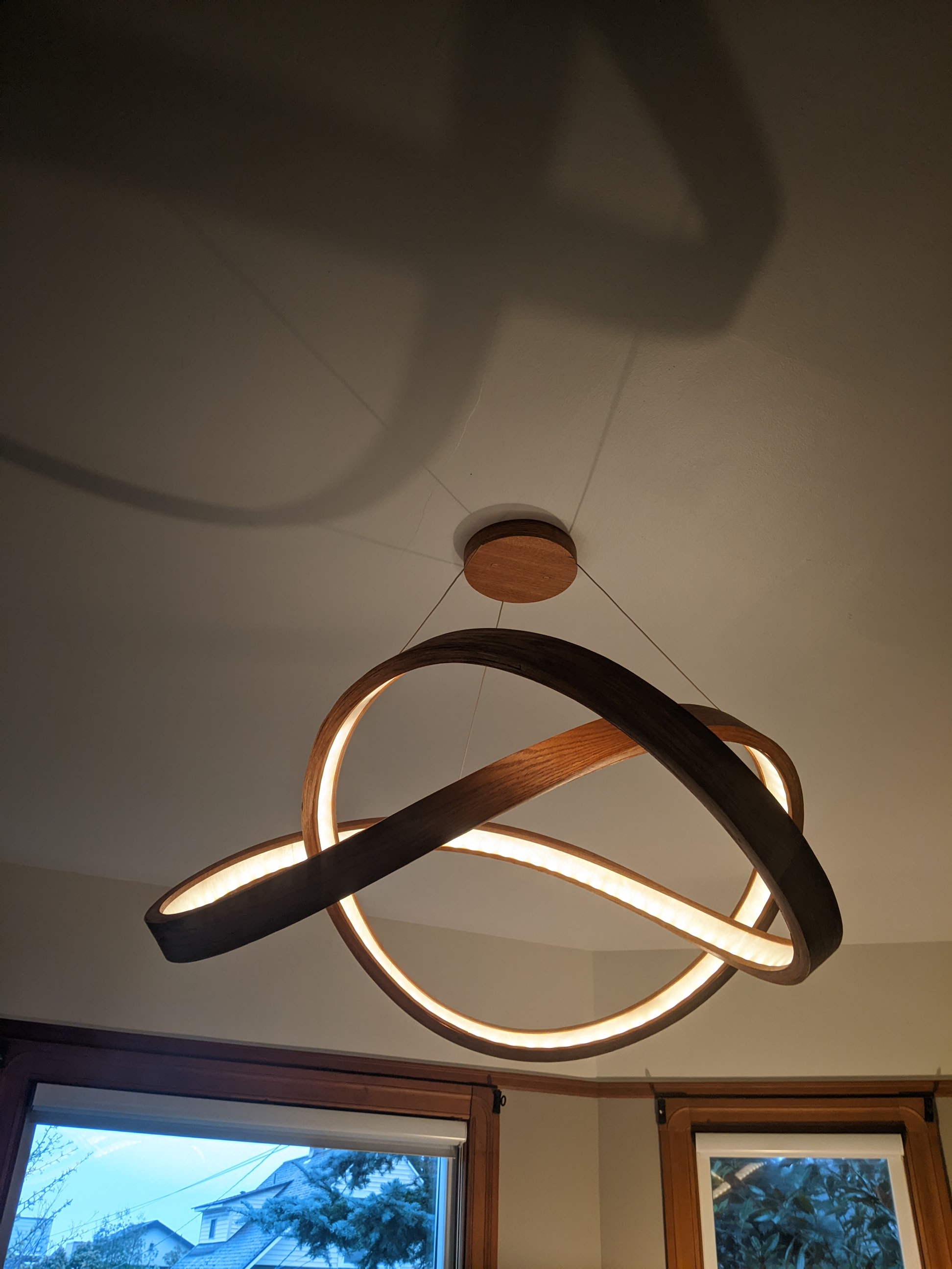 Above, the light installed in our living room. Below, photos from other angles and the build. Main structure is composed of 3 symmetric lobes, as illustrated in the photo of the paper prototype.